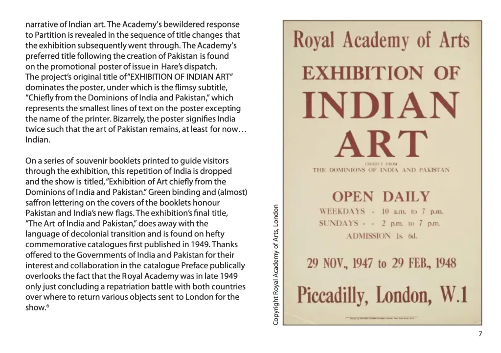 – “Indian Art from Pakistan: Partition and the Royal Academy’s Indian Art Exhibition, 1947,” Representing Partition: India and Pakistan, Wolfson College Cambridge, October 2017: Essay on the Royal Academy’s 1947 exhibition of Indian art. Full essay here.