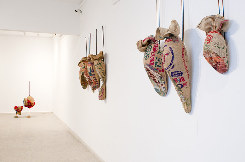 Solo presentation by sculptor Seema Nusrat at Canvas Gallery, Karachi. “Items of reuse employs found and readymade objects, it seems impossible in Karachi to hear the words gunny bags or gunny sacks without thinking of lost bodies. These textile sacks cannot be associated with their primary use in carrying rice or other dry goods alone. Instead they are continually connected to their re-use as wretched carriers of Karachi’s victims of political violence.”